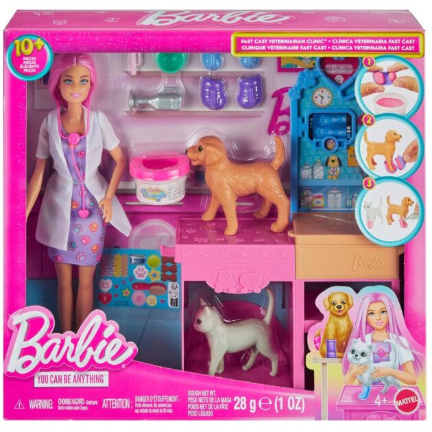 Explore a world of animal caretaking fun with the Barbie Fast Cast Veterinarian Clinic playset! When girls play with Barbie, they imagine everything they can become, and for those that love taking care of their furry friends, they can become Veterinarians! The clinic includes a pink hair Barbie doll, 2 pets, an exam table, and vet accessories! Kids can make casts for their animal patient with a realistic cast making feature to create casts for the patient’s legs and create wraps with the bandage maker! Kids will love bringing their animal friends to the clinic and back to good health! Doll cannot stand alone. Colors and decorations may vary. Makes a great gift for ages 4 and up.
