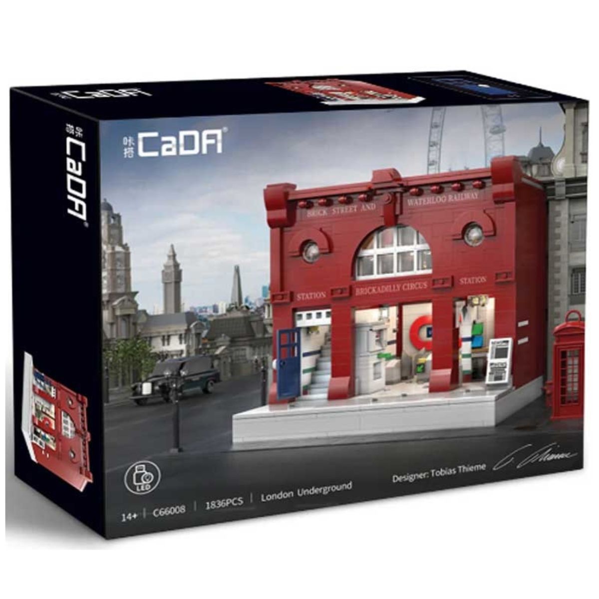 London’s Underground system is a unique blend of old and new, with many stations built in the late 19th century. Some of these London landmarks have been painstakingly preserved and are still reminding about great British empire times. CaDA is proud to present London Underground Station set C66008W – a great combination of bricks and British 19th century architectural style. The red brick modular build includes many distinctive underground details, such as functioning gate line and escalator. The smart construction allows manually opening the gate line, and passengers can get their ticket at the functioning ticket machine. On the second floor there is a tea room where all passengers can have their afternoon tea! The second floor slides out to provide a fast and easy access for interior viewing. The integrated LED lights in the set provide a dramatic, yet subtle night display scene.
