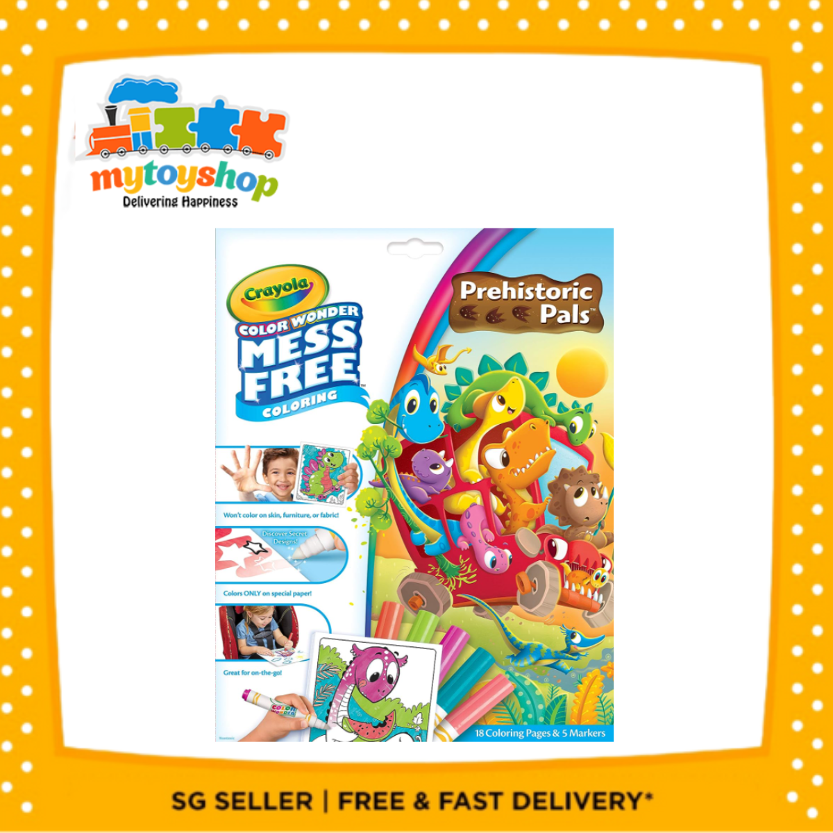 Kids can color their favorite dinosaurs and other creatures in a mess-free way with Crayola Color Wonder! Color Wonder colors appear only on special Color Wonder paper, not on skin, clothing, or carpets. This set contain 18 fun-filled coloring pages depicting cartoon renditions of T-Rex, Stegosaurus, Triceratops and many more! Each page works with all Color Wonder markers, paints and stamps. The convenient “foldalope” packaging works as reusable storage for your coloring pages and markers, making this the perfect travel-friendly activity. Includes 18 Prehistoric Pals pages and 5 Color Wonder Markers. Makes a great gift for girls and boys ages 3 and up!