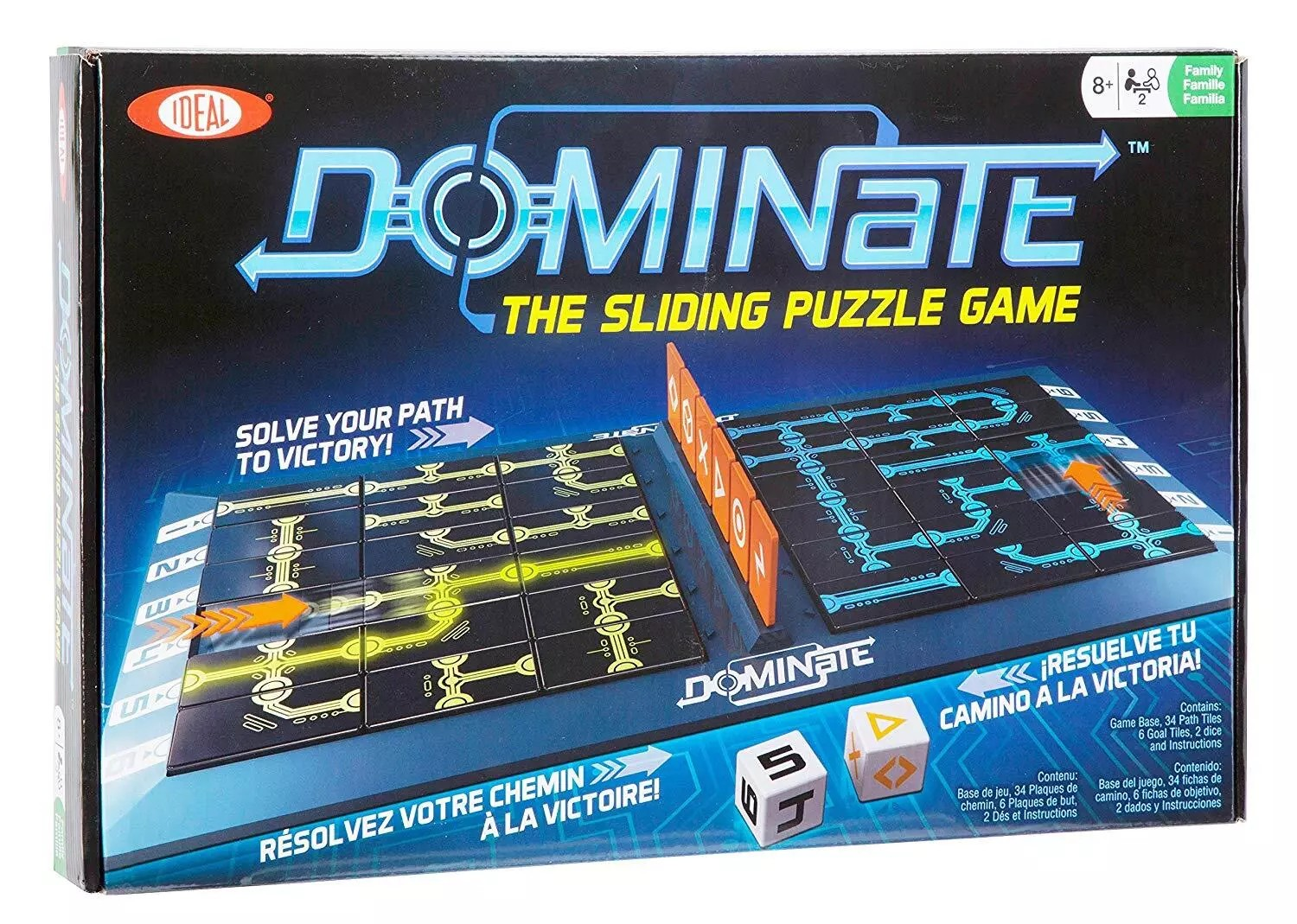 Ideal Dominate The Sliding Puzzle Game lets you solve your path to victory with this fast-paced puzzle game. Slide the tiles around on the board in order to connect a path from a start point to an end point. There are no turns- it’s a brain-bending race between players! Included with this game are the game base, 34 dominoes, 6 goal chips, 2 dice and instructions for two players. Recommended for children 8 years of age and older.