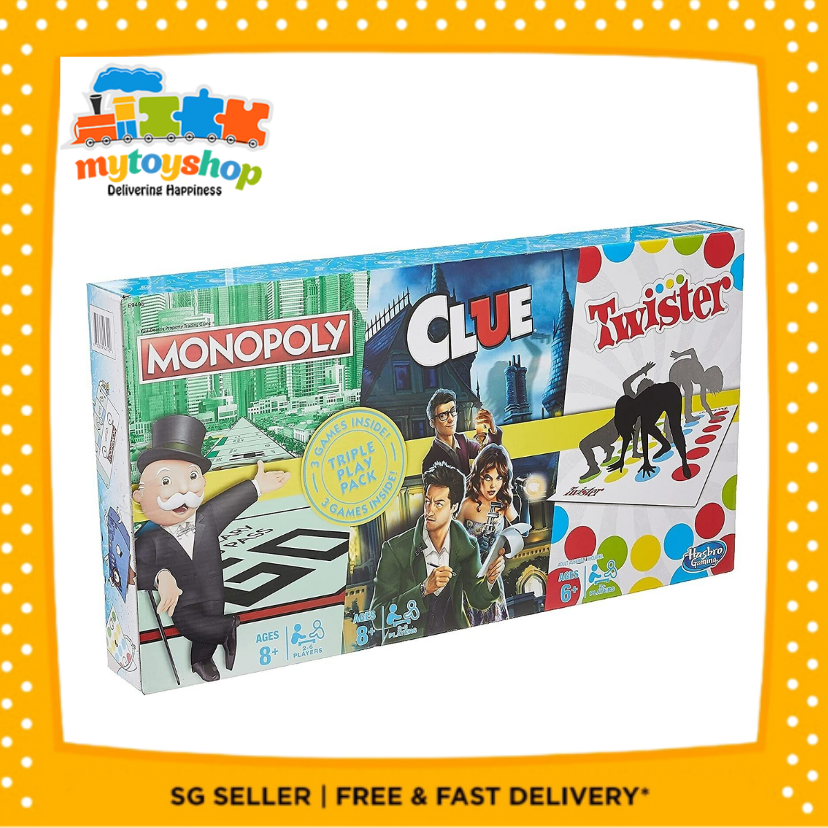 Game enthusiasts can enjoy this set that includes 3 classic games: Monopoly, Clue, and Twister, each with full gameplay. Great for parties, and family game night! Give a holiday or birthday gift with 3 times the fun. Hasbro Gaming and all related trademarks and logos are trademarks of Hasbro, Inc. The Hasbro Gaming and Monopoly names and logos, the distinctive design of the gameboard, the four corner squares, the Mr. Monopoly name and character, as well as each of the distinctive elements of the board and playing pieces are trademarks of Hasbro.