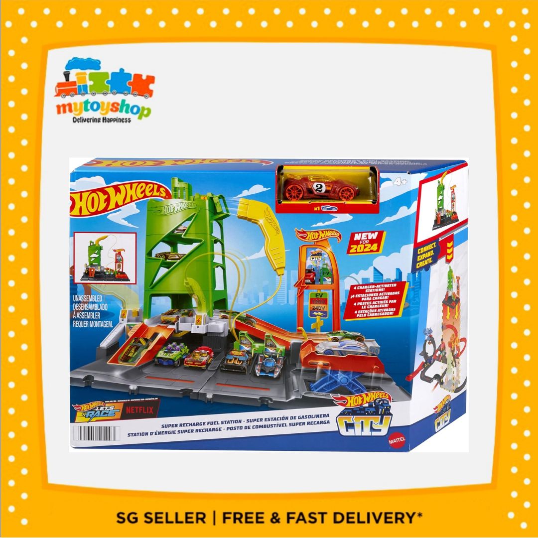 Get ready for charged-up track play with the Hot Wheels City Super Recharge Fuel Station! This interactive playset features a repositionable EV-like charging handle that kids insert into designated spots to activate cool details such as sign changes, car lifts and launchers. Park 10 1:64 vehicles on the set for added storytelling or storage; one Hot Wheels car is included, additional vehicles sold separately. The Super Recharge Fuel Station connects to other Hot Wheels sets and tracks so that kids can build out their own unique cityscape for open-ended adventures.