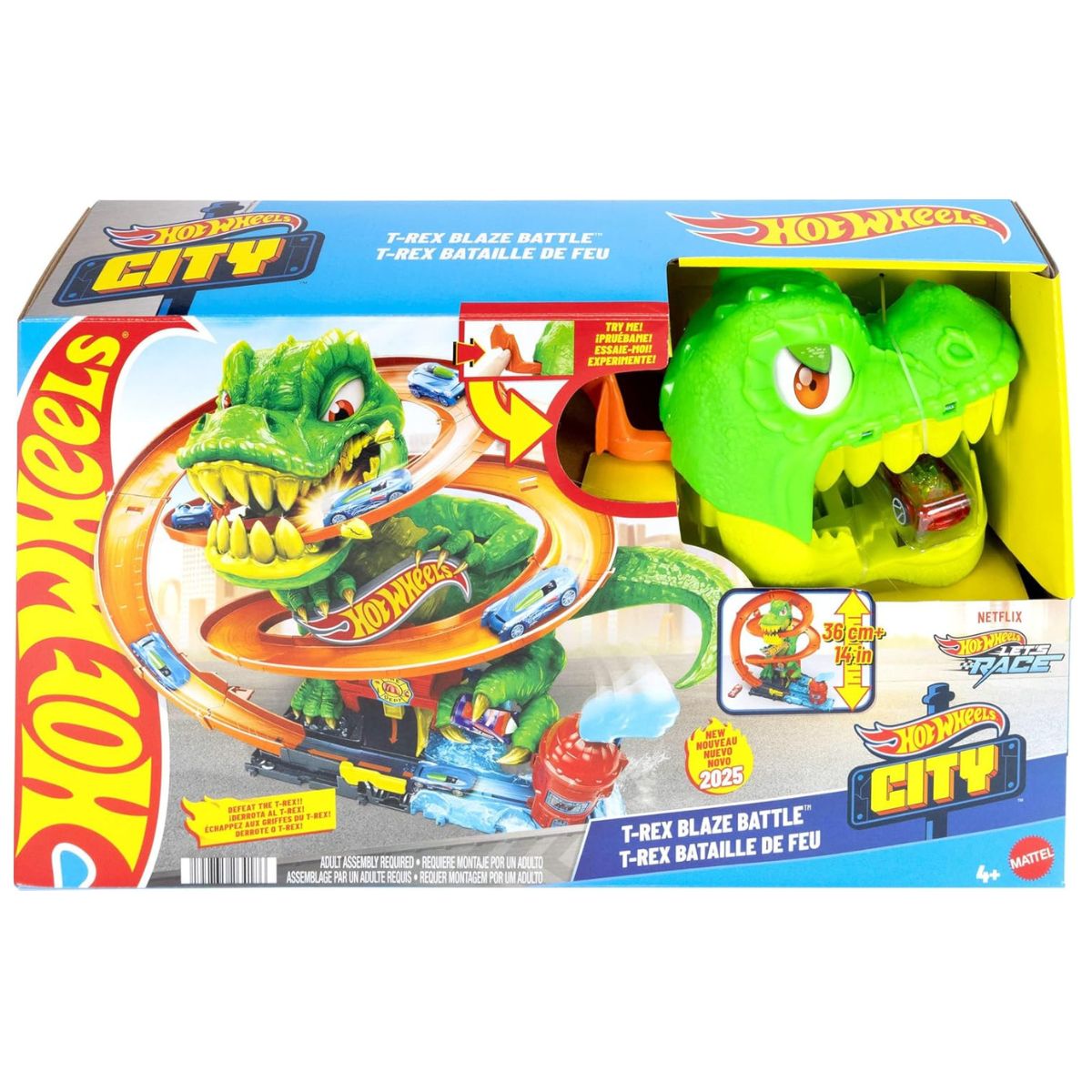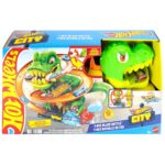 - Take on a hungry T-Rex that has attacked the Hot Wheels City fire station with a 1:64 scale toy car