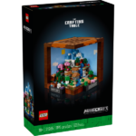 The set recreates the game’s iconic crafting table. Inside are 5 mini build modules featuring 12 Minecraft biomes, including the Taiga with a dripstone cave, Plains with a village, Ice Spikes with an igloo, Cherry Grove with an abandoned mineshaft, and the Deep Dark with a lush cave. 8 microfigures are also included: Steve, Alex, a skeleton, witch, Creeper™, villager, cow and pig. The mini builds and microfigures detach from the main model to enable a variety of display possibilities. Stickers featuring memorable in-game phrases can be added to the front of the Minecraft model
