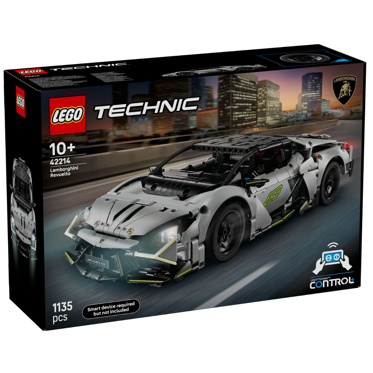 Inspire kids to build a detailed model version of the stunning Lamborghini Revuelto Super Sports Car with this LEGO Technic STEM building toy (42214) for boys and girls aged 10 and up. With features inspired by the real-life car, this model includes an engine cover and cool glow-in-the-dark headlight details. Meanwhile, the sleek design is sure to impress any Lamborghini super fan. But the build is just the start with this fast-action set. Access the CONTROL+ app to steer the car, control the lights and see live data feedback from the app’s cockpit screen as kids perfect their driving skills. This car building kit makes a great kids’ gift idea for boys and girls who love RC cars. It comes with the LEGO Builder app, which lets builders zoom in and rotate models in 3D and track their progress. LEGO Technic sets feature realistic movement and mechanisms to introduce young LEGO builders to the universe of engineering. Set contains 1,135 pieces.