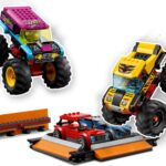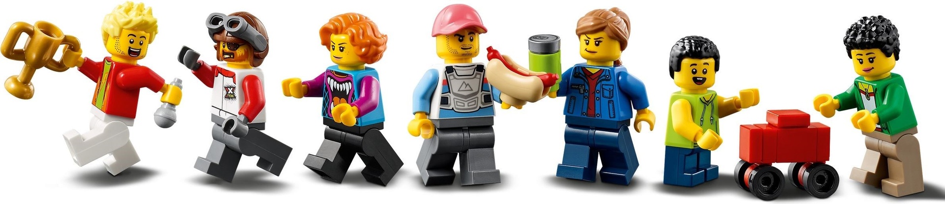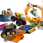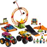 What’s in the box? All kids need to build 2 monster trucks, 2 cars with collapsible roofs, a ring of fire, launch ramps, flywheel-powered stunt bike, hotdog stand, podium, 6 minifigures and more.
