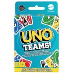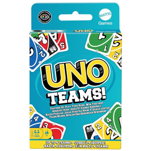UNO Teams is a new way to play the classic game! Players still match color, number and symbol but instead of every-man-for-himself, they team up in pairs of two and play together to win. Special cards and rules help teammates work together, but both players must get rid of all the cards in their hands to win. And remember, when you (or your partner!) are down to your last card, don’t forget to yell ‘UNO!’