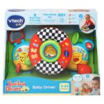 Toot-Toot here we go! Drive into the learning zone with the Toot-Toot Drivers Baby Driver from VTech! This brightly coloured role-play toy features a spinning, soft touch steering wheel, 2 stage indicator, ignition, gear stick and much more, all triggering realistic sound effects and fun phrases. Chunky light up car button attracts baby’s attention and plays lots of interactive car sounds. Driver also includes a wing mirror for self discovery and beep-beep horn button. Attach to a pushchair using the secure straps or play with on the floor. Includes 4 sing along songs & 10 melodies and introduces opposites. Requires 2 AA batteries. Batteries included for demo purposes only. New batteries recommended for regular use.