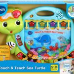 Dive into early reading with your toddler in the Touch and Teach Sea Turtle interactive story book. A holographic cover, bright colors and light-up buttons draw and hold your little one’s attention on eight double-sided book pages. Sea creatures fill this deep-sea story with learning experiences focused on letters, numbers, colors and animals with three learning modes. Press the piano key buttons on each page to hear the names of a variety of sea animals, listen to their sounds and practice counting. Go exploring with four light-up starfish and quiz questions that get little ones thinking and looking. Enjoy a robust 225+ songs, melodies, sounds and phrases in this take-along toddler book with carrying handle.